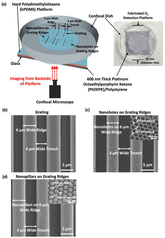 (a) Schematic of O2 detection setup. Scanning electron micrographs (SEMs) of (b) grating with 6/4 μm ridge width/trench width and 4.5 μm deep, (c) 280 nm wide and 500 nm deep nanoholes on ridges of grating, and (d) 280 nm wide and 500 nm deep nanopillars on ridges of grating.