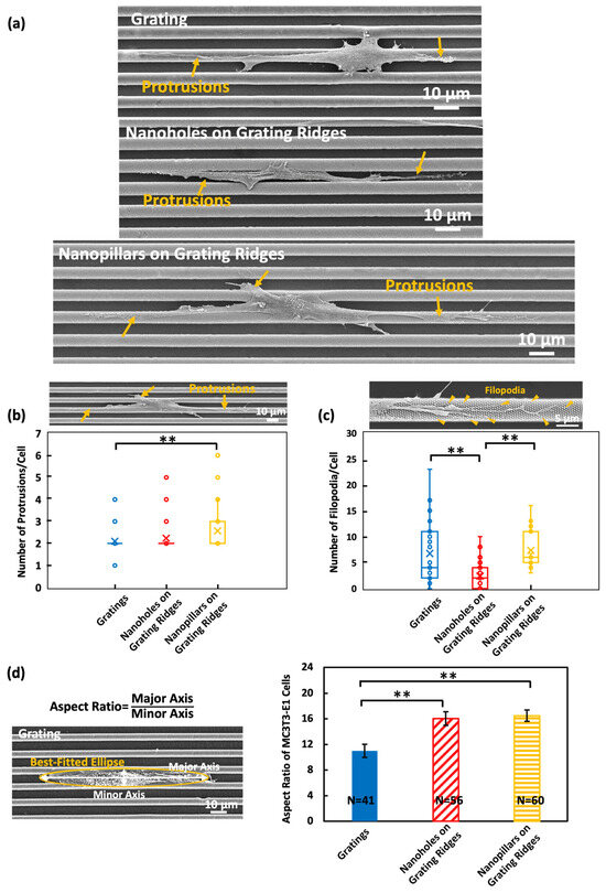 (a) SEMs of MC3T3-E1 cells migrated on surfaces of grating, nanoholes on grating ridges, and nanopillars on grating ridges. (b) Numbers of protrusions per cell, (c) filopodia per cell, and (d) cell aspect ratio analysis from SEMs. Mean values are represented by × and median values are represented by–in (b,c). One-way ANOVA with Tukey’s post hoc test, ** p < 0.01.