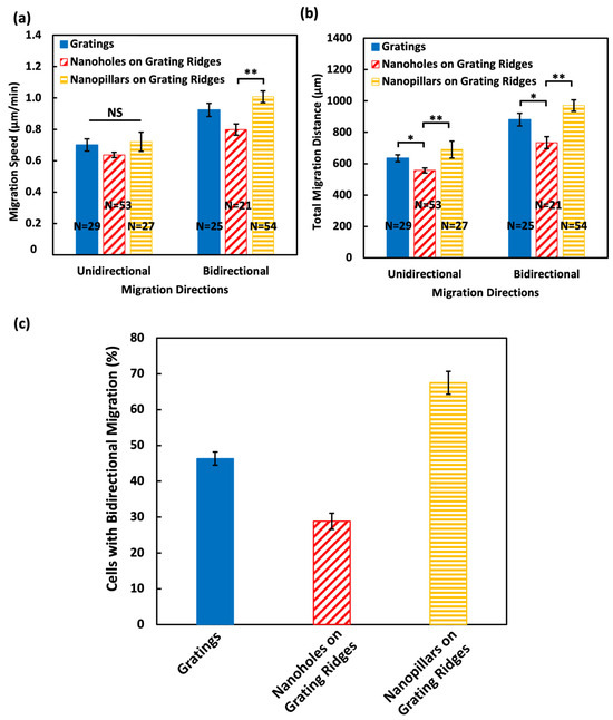 (a) Migration speed, (b) total migration distance, and (c) percentage of MC3T3-E1 cells that changed migrating directions on surfaces of gratings, nanoholes on grating ridges, and nanopillars on grating ridges during 16 h. One-way ANOVA with Tukey’s post hoc test, NS—not significant, * p < 0.05, and ** p < 0.01.