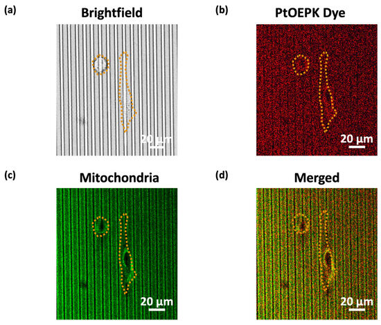 Figure 6a–d display the brightfield and fluorescence images of MC3T3-E1 cells on a grating. The yellow dotted line outlined the cell shape. The O2 consumption was characterized by the intensity of PtOEPK O2-sensitive dye, which emitted red light after the porphyrin ring absorbed the light energy [30], as shown in Figure 6b. To monitor the mitochondria of MC3T3-E1 cells, cells were incubated with MitoTracker Green before imaging, resulting in green light emission in the range of 490–550 nm, as shown in Figure 6c. The resulting images showed colocalization between the position of the mitochondria and the PtOEPK dye signal, independent of the cell shape. This suggests a correlation between mitochondria activities and PtOEPK dye intensity, which is an indication of O2 consumption, as illustrated in Figure 6d.