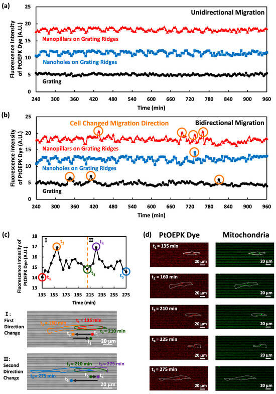 Changes in fluorescence intensity of PtOEPK dye around MC3T3-E1 cells during migration. (a) Unidirectional and (b) bidirectional cell migration on surfaces of gratings, nanoholes on grating ridges, and nanopillars on grating ridges. (c) Fluorescence intensity of PtOEPK dye over time during migration direction changes on surface of nanopillars on grating ridges. Colored dots indicate cell positions and arrows indicate direction of migration. (d) Fluorescence signals of PtOEPK dye and mitochondria of MC3T3-E1 cell varied as it changed migration directions.