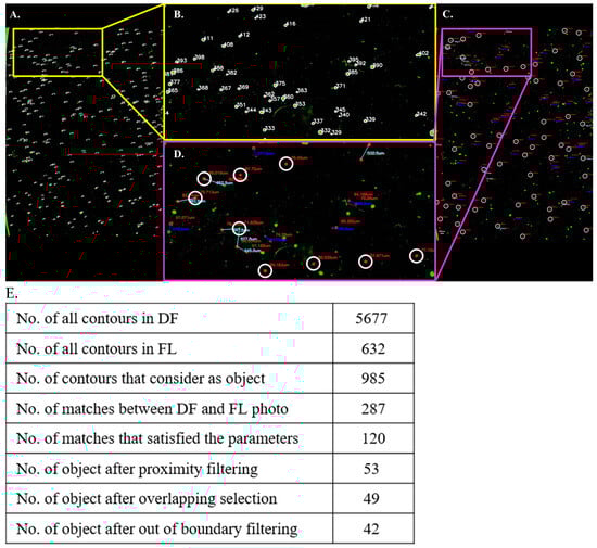Analysis results from the OneClick program are displayed as follows: (A) shows the image analysis results for all objects identified within the chamber; (B) provides a zoomed-in view of a specific region from (A), with white numbers indicating the identities of objects of interest; (C) presents the image analysis results for spheroids selected for encapsulation; (D) details the extracted region from (C), with red text marking the radii of contours, blue lines and text showing distances between adjacent cell masses excluded due to proximity filter violations, cyan lines and text highlighting distances between overlapping cell masses excluded due to overlapping filter violations, and white circles denoting the selected cell masses that meet all criteria for encapsulation as specified in Table 1; (E) contains a table summarizing the total number of spheroids filtered at each step from a 200 µL sample of spheroids. DF = darkfield, FL = fluorescence.
