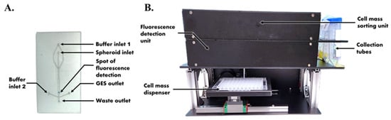 Following the selective encapsulation process, the samples were flushed out of the chamber using a pre-warmed PBS and were directed into a collection tube. The SFSS efficiently sorted and dispensed the GESs using the microfluidic chips and detection systems. The sorting chip was designed to segregate the crosslinked GESs from unwanted spheroids, cell debris, and un-crosslinked materials based on their sizes. As shown in Figure 3A, the buffer and crosslinked GES stream were introduced into the inlets of the sorter chip. The sample stream was then forced against two sorting regions composed of different sizes of slots, the design of which was previous reported in 2016 [].