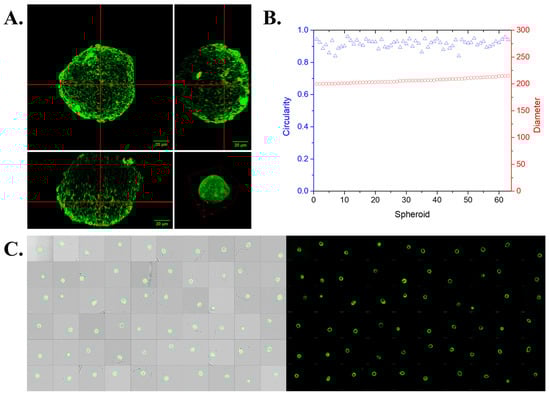 (A) Z-stack confocal microscopic image of an optically cleared spheroid. (B) The distribution of size and circularity of 66 samples of sorted spheroids. (C) Merged brightfield/fluorescence (left) and fluorescence (right) images of high-content whole-plate confocal tile scanning of a 96-well plate containing sorted GESs. The image was taken from a representative section of the plate, spanning from well B2 to G11, demonstrating the uniform distribution and consistent morphology of the GESs within each well.