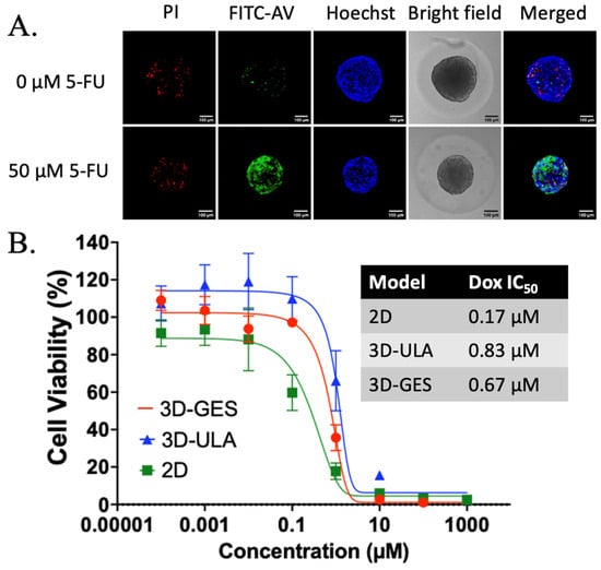 (A) Maximum Z-projection image of 5-FU treated and untreated HT29 GESs. (B) Drug–response curve of Dox treatment against monolayer 2D culture (2D), GESs (3D-GES) and 3D spheroids generated by ULA plate (3D-ULA).