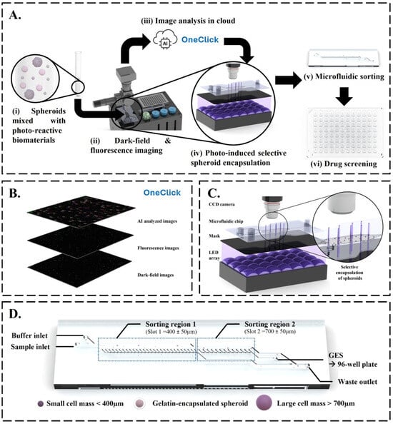Overview of the SFSS for uniform GES generation. (A) Overall workflow of the GES generation process. (B) Cloud-based OneClick AI image analysis of different images to identify desired spheroids. (C) Rendering image of fabrication chamber for selective photo-crosslinking GES encapsulation. (D) Rendering image of microfluidic sorter chip for selective sorting of the desired cell masses.