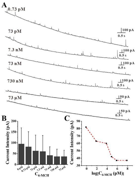 To investigate the feasibility of self-assembly, DLS characterizations were performed before and after injection of 6-MCH into Au NPs solutions. It was found that the hydrated particle size and polydispersity (PDI) were significantly increased after injection of 6-MCH (Figure 1A), indicating that 6-MCH successfully self-assembled on Au NPs. Considering that the monodispersing of NPs in collision experiments is vital for the self-assembly detection of thiol molecules on Au NPs based on SNEC, the stability of Au NPs in 0.8 mM HClO4 solution was investigated. The current intensity, which was measured before and after Au NPs dispersed in 0.8 mM HClO4 for 30 min, had essentially the same distributions, indicating that Au NPs can basically exist stably in 0.8 mM HClO4 for 30 min (Figure S3). Hence, SNEC tests were conducted for the above two samples within 30 min to avoid agglomerative effects, and peak-type current transients with an average current intensity of 95 pA appeared when only Au NPs existed in the system (Figure 1B,C). Whereas, after Au NPs and 6-MCH (73 μM) co-incubation at room temperature for 10 min, the average current intensity markedly decreased to 37 pA. Considering that the cyclic voltammetry (CV) of CFME in 0.8 mM HClO4 before and after 6-MCH added into Au NPs solutions were similar (Figure S4), the interaction between CFME and 6-MCH was ignored. So, the relatively noticeable distinction in current intensity caused by 6-MCH occupied some active sites of Au NPs [29], indicating that SNEC can detect the self-assembly of thiol molecules on Au NPs sensitively.