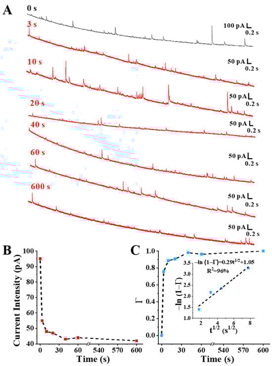 As shown in Figure 3A, the self-assembly process of 6-MCH on Au NPs was monitored by SNEC under the condition of C6-MCH/CAu NPs = 1.2 × 103, and the uneven peak-type current transients were caused by the heterogeneity of Au NPs and self-assembly efficiency of 6-MCH on Au NPs. Figure 3B showed that the current intensity significantly decreased when the incubation time was only 3 s, then the current intensity slowly decreased with the extension of incubation time. To further investigate the kinetics of the assembly process, we converted the current intensity into the percentage of adsorbed species in the entire area of Au NPs (Γ) by Equation (1).