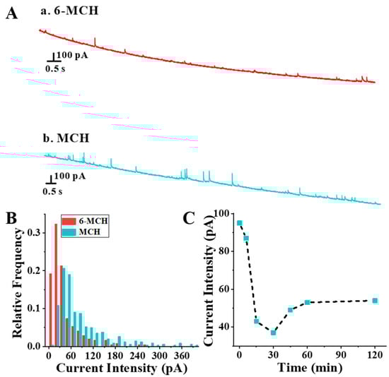 Chronoamperometry curves (A) and frequency distributions of current intensity (B) of Au NPs assemblies with 6-MCH and MCH. (C) Current intensity of Au NPs assemblies with MCH (CMCH/CAu NPs = 1.2 × 103) at different times.