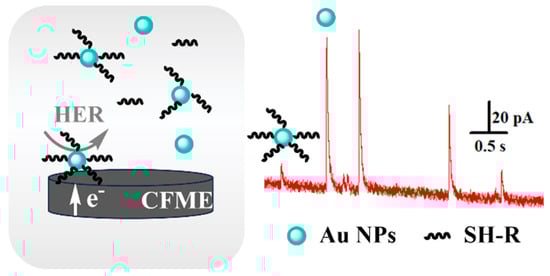 After adding 110 µL of the above self-assembled Au NPs to 10 mL of 0.8 mM HClO4, the mixture was sonicated for 30 s to disperse uniformly for the further SNEC tests which were conducted according to our previous work [30]. Specifically, a conventional three-electrode setup with a carbon fiber microelectrode (CFME, d = 7 µm, Figure S2) as a working electrode [31], Ag/AgCl (3 M KCl) as reference electrode, and a Pt wire as a counter electrode were used. The spikes were recorded and magnified by an EPC-10 patch-clamp amplifier (HEKA Electronics, Stuttgart, Germany), and the signals were sampled at 10 kHz. The amplifier’s internal low-pass Bessel filter and I_Bessel filter was set to 10 kHz and 0.1 KHz, respectively. The potential was held at −0.6 V where the CFME is inert toward hydrogen evolution reaction and the current intensity and collision frequency of Au NPs are the highest. Additionally, all collision experiments were performed in a Faraday cage within 30 min to minimize agglomerate effects [17].