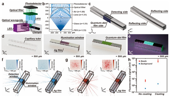 Calculation of the fluorescence detection in the compact detection module. (a) Configuration of the optical system in the detection module. (b) Simulation of the ray trajectories in the detection part of the optical system. (c) Schematic diagram of the capillary tube deposited with the Ag film and the QD film. (d) Fabrication procedure of the capillary tube. (e) The capillary tube with the Ag and QD films exposed in the UV light. (f) Intensity distribution projected on the photodetector and the ray tracing of the light emitted from the QD film when the capillary tube is deposited with and without the Ag film. (g) Ray tracing and the intensity distribution on the photodetector of the emission light from the fluorescent beads flowing through the microchannel when the capillary tube is without and with the Ag film. (h) The influence of the Ag film coating over the fluorescence detection. The measurement was repeated three times.
