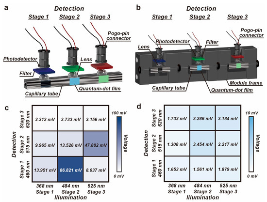 The detection module is integrated with microfluidic system, illumination system and detection system, as shown in Figure 4a–c. The frame was fabricated by projection micro-stereolithography 3D printing. The printing resolution is 10 μm, which is sufficiently high to precisely install the components and align the modules. There is a slot in front of the illumination window. The slot is filled with the transparent RTV silicone, which is used as an optical waveguide connecting the QD film and the output of the illumination module. The UV light can be efficiently guided to the QD film for the generation of the excitation light. The QD films for the excitation generation and the optical filters for the emission filtering can be customized as required. The optical components are fixed in the frame using black silicone.