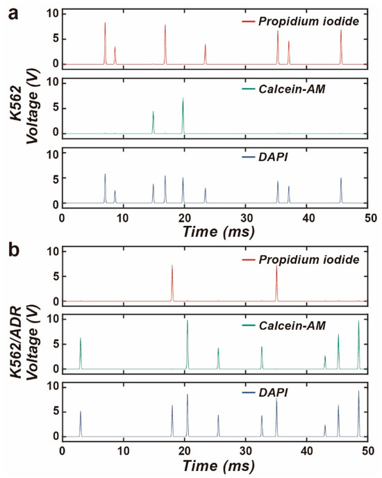 The waveforms for the three fluorescence channels detected by the M-FCM for (a) K562 cells and (b) K562/ADR cells after 24-h culture in the doxorubicin.