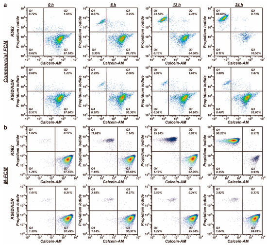 The scatter plots obtained by (a) the commercial FCM and (b) the M-FCM for K562 and K562/ADR cells over 24-h culture in the doxorubicin. Lower right: Positive Calcein-AM expression and negative PI expression (live cells). Upper left: Negative Calcein-AM expression and positive PI expression (dead cells).
