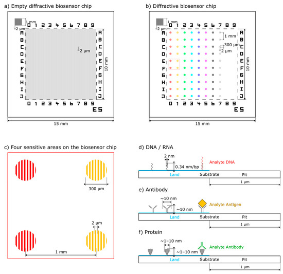 The sensor principle, presented here, is based on 15 mm × 15 mm biosensor quartz chips with a 10 mm × 10 mm strip grating pre-patterned functionalized surface of 2 µm period (Figure 1a). These chips are further prepared with spots of different capture molecules (Figure 1b). Due to the pre-patterning, the capture molecules are also distributed in a square-wave strip grating with a = 2 µm period and 1:1 duty cycle (1 µm land and 1 µm pit) (Figure 1c). In our work, each column typically consists of 10 spots with d ≈ 300 µm diameter and l = 1 mm distance of the same condition (type of capture molecule and concentration). Each row typically consists of 8 spots of different conditions (Figure 1b). According to the application and the analyte of interest, we show that the diffractive biosensor chip can be prepared for capturing specific DNA, antigens, and antibodies (Figure 1d–f).