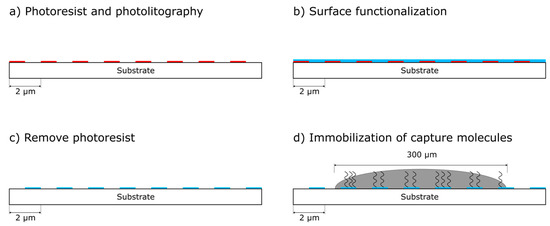 As a third and last step, the chips become a specific biosensor by immobilization of selected capture molecules on the prepared substrates using a piezoelectric spotter (Nanoplotter 2.1, GeSim, Grosserkmannsdorf, Germany) with spot volumes of approximately 400 pl (8 nl each droplet, 20 droplets/spot, Figure 1b and Figure 2d).