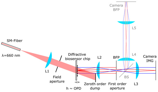 Schematic optical diagram of the imaging diffractometric biosensor reader including the diffractive biosensor chip. A single-mode fiber-coupled 660 nm Laser becomes collimated using L1 to illuminate the diffractive biosensor chip homogeneously. The illumination angle is tuned so that the first diffraction order leaves the biosensor chip in the normal direction. The grating-like biosensor chip allows the high-intensity zeroth-order diffraction to be separated from the first-order diffraction before illuminating any other optical component, efficiently avoiding scattering. The biosensor chip thus illuminated in the dark field is imaged by L2 and L3 on the camera IMG (blue lines: chief rays, red lines: marginal rays of the first diffraction order). A small aperture in the back focal plane (BFP) of L2 selects only the first diffraction order of the biosensor chip grating and suppresses other spatial frequencies. For technical diagnoses, a beam splitter BS is inserted, allowing for additional imaging of the BFP using L4, L5 and camera BFP.