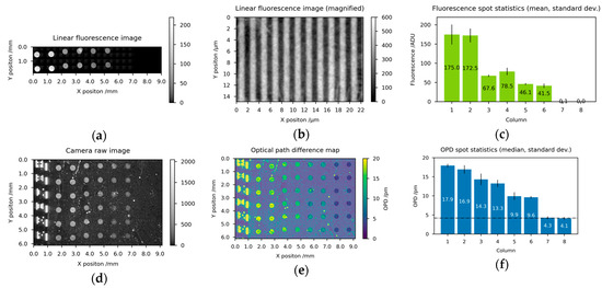 Fluorescence microscopy and diffractometric readout of a biosensor chip for proteins with associated quantitative imaging analysis: (a) stitched linear fluorescence microscopy image (b) magnification of a spot detail of column 1 in (a,c) mean and min-max of the 2 spots for each of the 8 columns of (a,d) linear raw image of camera IMG using 10 s exposure time and 2 mW/cm² irradiance (e) normalized and OPD converted image from (d) with semi-transparent/white spot selection mask overlay, (f) median and standard deviation of the 6 spots for each of the 8 columns of (b). Columns 1–3 are spotted with the nucleoprotein in decreasing concentration (300, 100, 20 µg/mL) to measure total anti-N antibodies binding events. Columns 4–6 are spotted with the spike protein (300, 100, 20 µg/mL) to measure total anti-S antibodies binding events. Column 7 contains the biotin monoclonal anti-human antibody (20 µg/mL) to serve as spotting control for both the OPD signal and the fluorescence signal (considering the background). The last column could potentially contain residues of the wash buffer solution and serve as a background measure.