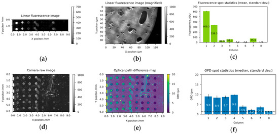 Fluorescence microscopy and diffractometric readout of a biosensor chip for short oligonucleotides with associated quantitative imaging analysis: (a) stitched linear fluorescence microscopy image (b) magnification of a spot detail of (c) mean and min-max of the 2 spots for each of the 8 columns of (d) linear raw image of camera IMG using 10 s exposure time and 2 mW/cm² irradiance, (e) normalized and OPD converted image from (d) with semi-transparent/white spot selection mask overlay, (f) median and standard deviation of the 6 spots for each of the 8 columns of (b). Columns 1–2 feature besides the two short single DNA strands two fluorescence labels for each successful hybridization event and therefore show the highest fluorescence value. Columns 3–6 feature a single fluorescence label for each successful hybridization and show a decreased fluorescence as well as a decreased OPD value compared to columns 1–2. The last two columns 7–8 could potentially contain residues of the wash buffer solutions and serve as a background measure.