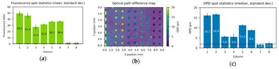 Fluorescence microscopy and diffractometric readout of a biosensor chip for protein-DNA interactions with associated quantitative imaging analysis: (a) mean and min-max of the 2 spots for each of the 8 columns of the linear fluorescence microscopy image (b) normalized and OPD converted image from the linear raw image of camera IMG with semi-transparent/white spot selection mask overlay, (c) median and standard deviation of the 6 spots for each of the 8 columns of (b). Columns 1–2 and 3–4 are spotted with modified oligonucleotides (N150B, 3′ end), featuring the high-affinity tag biotin at different concentrations (20 µmol/L, 10 µmol/L) and columns 5–6 are spotted with the same oligonucleotide but without a high-affinity tag (N150 20 µmol/L). Columns 7–8 are spotted with buffer only to provide a background measure.