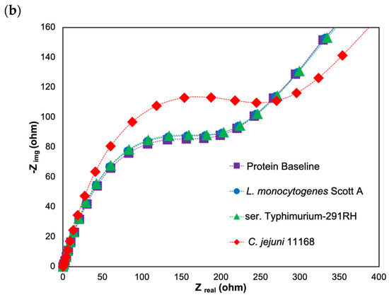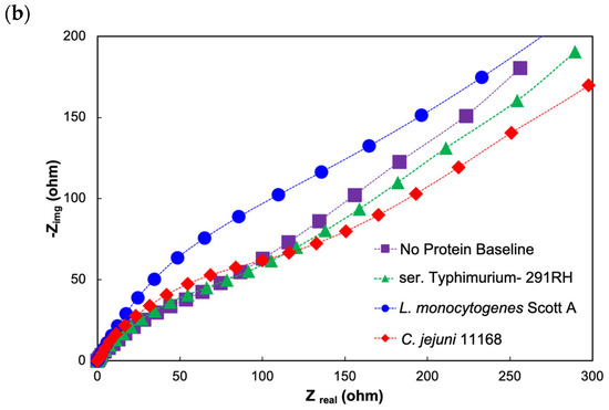 A known concentration (105 CFU/mL) of C. jejuni 11168 was used as a target analyte, whereas the same concentrations of L. monocytogenes Scott A and ser. Typhimurium-291RH were used as nontarget analytes. All three cultures were prepared in a diluted cecal sample. Finally, the EIS measurements were taken for the three cultures described earlier in the Section 2, and ΔRCT was calculated as shown in Equation (2).
