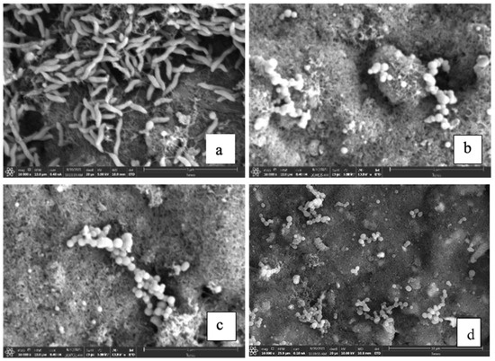 Phage protein CC-FlaGrab specificity in SEM with target and nontarget bacteria. Phage protein-modified electrode after exposure to C. jejuni 11168 (a), L. monocytogenes Scott A (b), ser. Typhimurium-291RH (c), and BSA molecule (d).