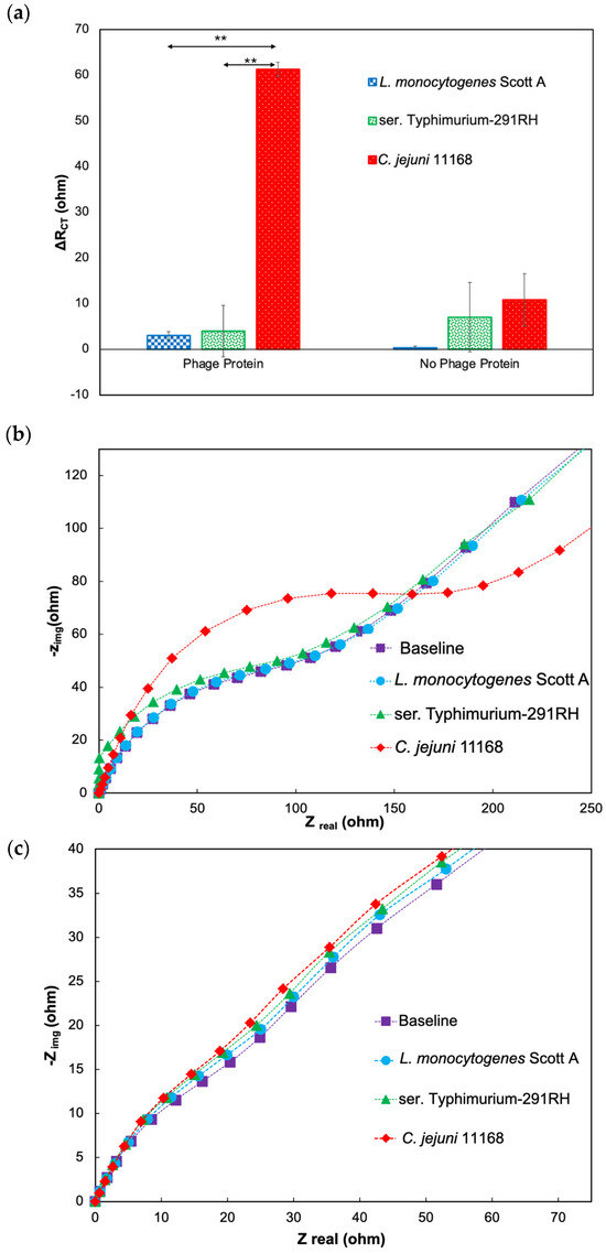 Response to target and nontarget pathogens in chicken cecal samples in the presence and absence of phage protein. (a) ΔRCT (ohm) values of the response as the difference from baseline values with phage protein and no phage protein. (b) Nyquist plot of the impedimetric response to target and nontarget bacterial cells in the presence of phage protein. (c) Nyquist plot of the impedimetric response to target and nontarget bacterial cells in the absence of phage protein. The asterisk indicates statistical significance (** p < 0.01, using One way-ANOVA with Post-hoc Tukey HSD test).