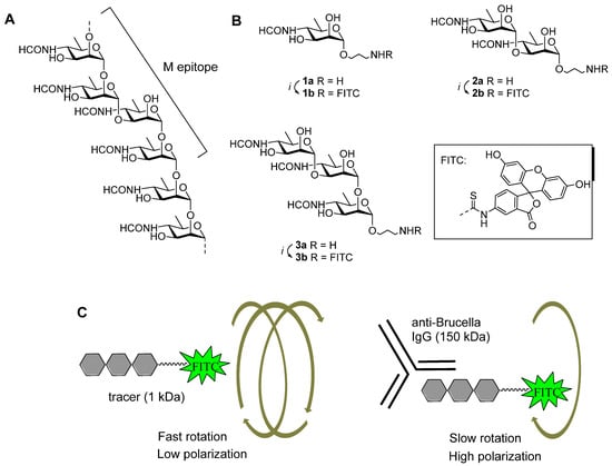 (A). Structure of the Brucella O-polysaccharide showing the M epitope. (B). Synthesis of FITC-labeled biotracers 1b–3b used in FPA diagnostic tests. Reagents and conditions: i: FITC (1.2 eq), Na2CO3 (3 eq), DMF, H2O, 60 °C. (C). The principle of FPA detection of brucellosis.