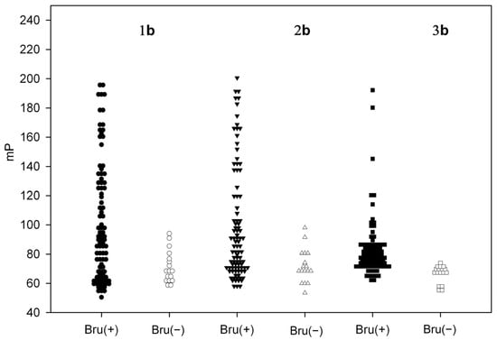 Medians, means, and standard deviation of fluorescence polarization (mP) of Bru(+) and Bru(−) bovine serum samples registered with the use of tracers 1b–3b.