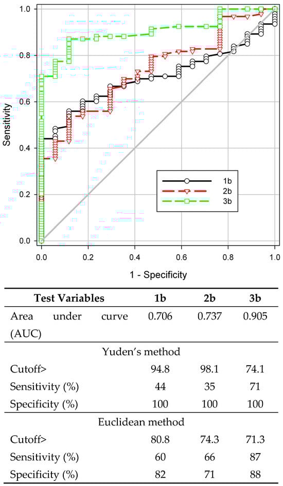 Receiver operating characteristic (ROC) analysis of sensitivity (%) plotted against 1—specificity (%) to determine the optimal cutoff value of fluorescence polarization immunoassay (FPA) for the detection of antibodies against Brucella by FPA for tracers 1b–3b. The characteristics of the ROC curves calculated by Yuden’s and Euclidean methods are presented in the table below.