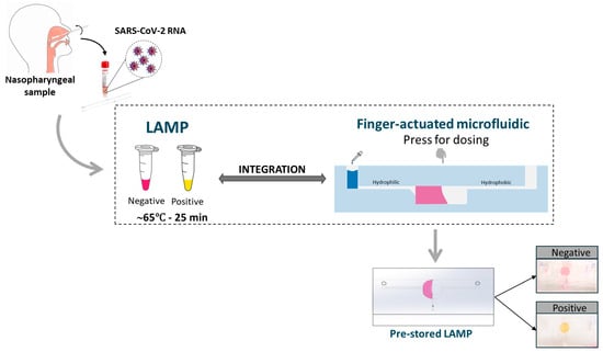 Loop-mediated isothermal amplification (LAMP) has attracted significant attention for rapid and accurate point-of-care diagnostics. However, integrating sample introduction, lysis, amplification, and detection steps into an easy-to-use, disposable system has so far been challenging. This has limited the uptake of the technique in practical applications. In this study, we developed a colourimetric one-step LAMP assay that combines thermolysis and LAMP reaction, to detect the SARS-CoV-2 virus in nasopharyngeal swab samples from COVID-19-infected individuals. The limit of detection was 500 copies per reaction at 65 °C for 25 min in reaction tubes. Additionally, we developed a finger-operated capillary-driven microfluidic device with selective PVA coating. This finger-actuated microfluidic device could self-dose the required sample amount for the LAMP reaction and inhibit sample evaporation. Finally, we integrated the LAMP assay into the microfluidic device by short-term pre-storage of the LAMP master mix. Using this device, nasopharyngeal swab samples from COVID-19-infected individuals showed positive results at a reaction time of 35 min at 65 °C. This integrated device may be adapted to detect other RNA viruses of interest rapidly.