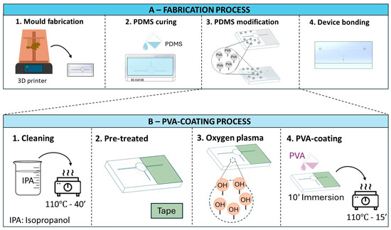 Schematic (A) illustrates four main steps of the fabrication process for the microfluidic devices. (B) describes the detailed steps of selective PVA coating for the PDMS modification step (A-3).