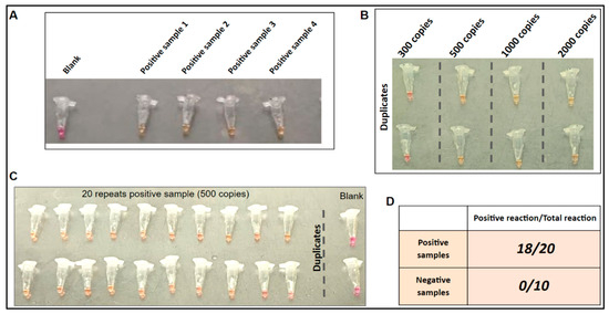 Limit of detection (LOD) of LAMP reaction. As shown in Figure 4B, the results showed that the assay was able to detect viral concentrations as low as 500 copies per reaction after 25 min of incubation. Additionally, with this concentration, positive reactions were observed in 18 out of 20 replications when using positive sample 1 (Figure 4A).