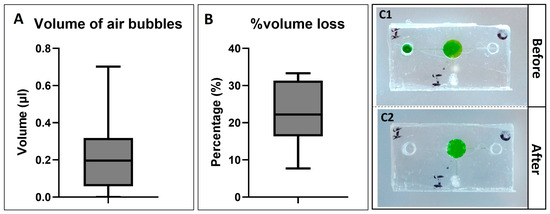 (A) shows the total measured volume of air bubbles trapped inside the device after the filling process (n = 13). (B) shows the percentage of volume loss after heating (n = 13). The microfluidic devices are shown before heating (C1) and after heating (C2).