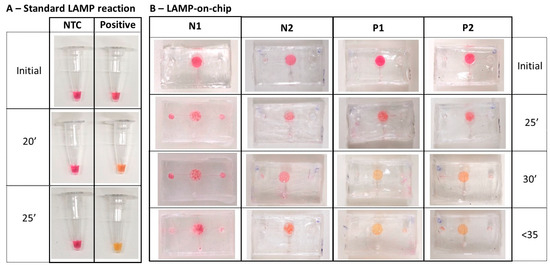 LAMP reaction under different conditions: (A) LAMP-on-tubes reactions; (B) LAMP-on-chip reactions for no-template control (N1 and N2) and positive sample (5000 copies/µL of cDNA N-gene SARS-CoV-2) (P1 and P2).