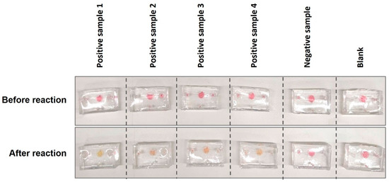 The prototype was then tested on the clinical samples. As shown in Figure 9, the one-step LAMP on a microfluidic device successfully amplified four positive clinical samples, which turned yellow after 35 min of incubation. In contrast, the negative sample and blank remained pink. As previously discussed, the incubation period was longer than under normal conditions. Additionally, the intensity of the yellow colour varied among the four positive samples, likely due to differences in the viral load before and after reaching the reaction chamber.