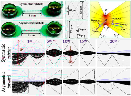 As shown in Figure 1, Lu et al. designed a microchip structure that focuses particles in a ratchet microchannel using DC-DEP. Particle focusing occurs passively via lateral forces induced by the flow and channel structure, directing particles to equilibrium positions in the channel cross-section. Symmetric ratchet microchannels were found to provide better particle focusing than asymmetric ones due to a larger tensor angle. In asymmetric ratchet microchannels, the asymmetry and directional switching of particle DEPs on the upstream and downstream sides of ratchets resulted in stronger forward than backward focusing. However, the ratchet structure has a significant disadvantage: it generates a much higher electric field around the ratchet tip, potentially causing thermal and electrical issues in the sample and microfluidic system [53].