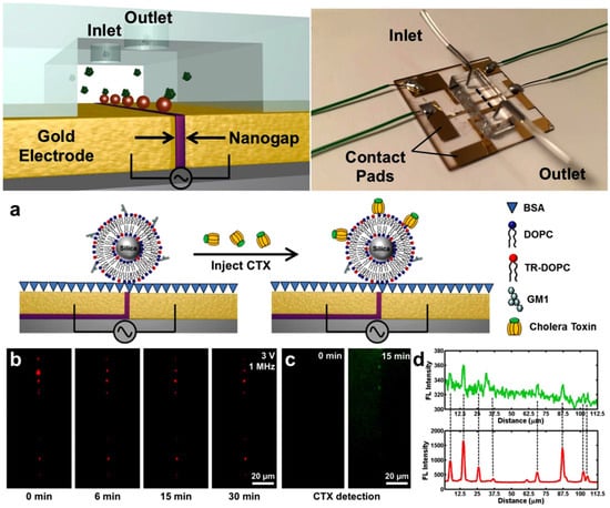 Schematic illustration of the nano-gap electrode-based AC dielectrophoretic microfluidic chip for the trapping of biological particles. (a) Application of an AC bias, (b) Injection of SSLB particles and trapping by under a bias of 3 V, (c) Before and after injection of CTX for 15 min, (d) Colocalization of SSLBs with the CTX. Reproduced from ref. [61]. Copyright 2021, Elsevier.