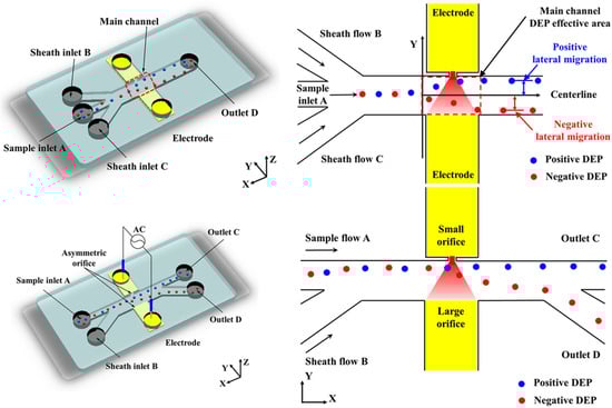 Li et al. designed a chip structure featuring a novel method for particle separation in bifurcated microchannels using a DC electric field. This continuous, sheathless electrodynamic separation utilizes wall-induced electric lift to concentrate particles along the main branch’s centerline, then deflects them into size-dependent flow paths in the side branches. The technique demonstrated label-free separation of 5 µm and 15 µm spherical polystyrene particles along a 2 cm bifurcated microchannel. However, high DC fields can potentially damage biological entities. This risk can be reduced by using DC-biased AC fields [54]. Zhao et al. developed a microfluidic device with nano-orifices that uses DC-DEP to continuously separate similar-sized microns and nanoparticles through pressure-driven flow with varying conductivities. The device successfully separated 140 nm polystyrene from 150 nm magnetic nanoparticles, 470 nm magnetic-coated PS from 490 nm PS nanoparticles, 5.2 μm magnetic-coated PS from 7 μm magnetic-coated nanoparticles, and 14 μm silver-coated hollow glass beads from 15 μm PS particles. Unlike conventional methods, this technique employs asymmetric holes on both sides of the channel wall to create a strong, inhomogeneous electric field, allowing for effective nanoparticle separation while avoiding the Joule heating effect [55].