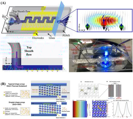 Schematic illustration of tunable separation of particles and exosomes in the hybrid (A) dielectrophoresis-inertial microfluidic chip Reproduced from ref. [97]. Copyright 2018, Elsevier; (B) dielectrophoresis-deterministic later displacement arrays. Reproduced from ref. [99]. Copyright 2024, MDPI.