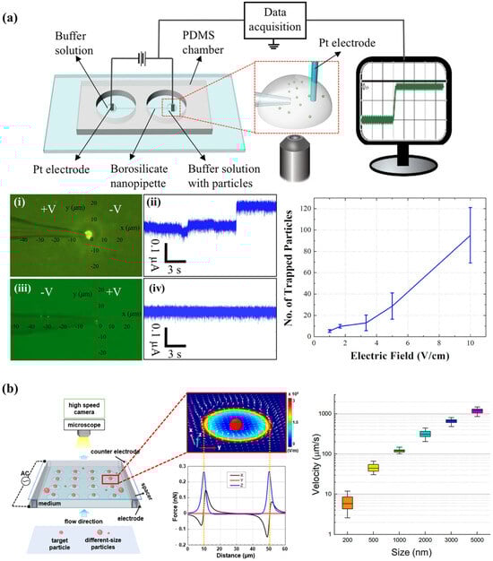 Shi et al. reported a nanopipette-based DEP device designed for the rapid capture of nanoparticles from solutions of various ionic strengths under a low applied DC field. The device effectively trapped particles in the close-proximity region in front of the pipette tip. Optimal trapping conditions were established using a 2-micrometer-diameter pipette and a 10 V/cm positive bias in a 10 mM KCl solution. The capture yield was observed to increase over time, stabilizing after approximately 40 min. The authors successfully captured exosomes from healthy donor plasma and liposomes resuspended in a PBS solution under applied negative potential. Additionally, they demonstrated selective trapping of liposomes, and 510 nm carboxylic acid polystyrene beads were suspended in PBS solution by adjusting the polarity of the voltage on the pipette [104] (shown in Figure 10a). Kwak et al. reported a dielectrophoretic corral trap system for size-selective particle capture, featuring micron-sized circular traps. By applying AC voltage, the DEP electrodes generated non-uniform electric fields. They carefully selected the frequency of the AC voltage, using the CM factor to create conditions where particles with significant susceptibility to the electric field gradient were captured by the DEP gates, while smaller particles passed through unaffected. The system was tested with particles of 2 μm and 3 μm radii to evaluate size-selective trapping efficiency. They found that higher microchannel heights resulted in increased trapping efficiency, contrasting with traditional shallow channel methods. This configuration enabled rapid isolation and concentration of specific-sized particles in a single step, overcoming the inefficiencies of multiple treatments and dilution steps in existing separation techniques [105], as shown in Figure 10b.