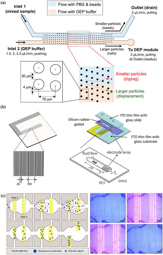Barik et al. utilized microfluidic channels and nanogap chip architecture in their experimentation. By applying alternating current (AC) bias voltage and modulation of fluid flow rates, they successfully captured and immobilized 700-nanometer-sized SSLB (Solid Supported Lipid Bilayer) particles within nanogaps. They employed DEP to linearly arrange suitable receptors within the nanogaps without necessitating chemical modifications or patterning. Unlike traditional microarrays, the nanogap platform exhibits flexibility across a range of particle sizes, all while ensuring operational voltages are kept at levels that minimize heat and bubble formation [61] (shown in Figure 3). Oshiro et al. introduced an innovative chip design for conducting experiments on cell separation. This chip features a diagonal electrode arrangement that includes both a High-Throughput Dilution (HDF) region downstream and a DEP region. Within the DEP region, applying voltage prompts charged cells to alter their migration direction, swiftly flowing towards the outlet. Unlike similar DEP-based cell separation devices, this chip eliminates the need for buffer exchange before sample loading. Instead, automated buffer exchange within the chip’s HDF region swiftly displaces cells from the sample into the appropriate buffer, ensuring minimal compromise to cell quality. Additionally, the authors successfully achieved target cell separation by manipulating frequency [62]. Hawari et al. designed a new electrode configuration introducing DEP to enhance the harvesting efficiency of marine microalgae. This configuration comprises a central electrode and four symmetrical outer electrodes. The authors employed alternating current modules and AC-DEP modules for microalgae harvesting. Under optimal conditions, the AC-DEP module reduced the aluminum content in the microalgal biomass by 52% compared to the AC module without significant differences in harvesting efficiency. By utilizing the new asymmetric electrode configuration and applying the AC-DEP module for marine microalgae harvesting, a significant reduction in aluminum content was achieved while maintaining high harvesting efficiency [63].