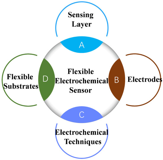 Flexible electrochemical sensors are indispensable in various aspects of life, such as monitoring physiological parameters to detect potential health issues at an early stage. Ongoing advancements in materials science, fabrication techniques, and electronic system integration will continue to enhance the capabilities and applications of flexible electrochemical sensors [63,64]. Flexible electrochemical sensors are poised to become essential tools for future technologies in health monitoring, environmental protection, and industrial process control. Despite operating on the same basic principles as traditional electrochemical sensors—utilizing the redox reactions of analytes at the sensor’s surface—the key difference lies in their ability to maintain performance while deformed. In summary, flexible electrochemical sensors are crucial in various fields because of their sensitivity, selectivity, and real-time monitoring capabilities [65,66,67]. Ongoing research focuses on enhancing sensor performance, expanding their range of applications, and addressing current challenges to meet the growing demand for reliable chemical detection technologies [68,69,70].