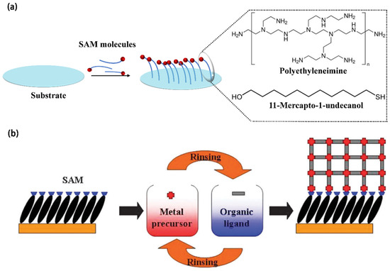 (a) Hydrophilic treatment of the substrate. (b) A schematic diagram illustrating the step-by-step approach for growing MOFs on substrates functionalized with self-assembled monolayers (SAMs) (O. Shekhah, Layer-by-Layer method for the synthesis and growth of surface-mounted metal–organic frameworks (SURMOFs). Reproduced with permission [132].
