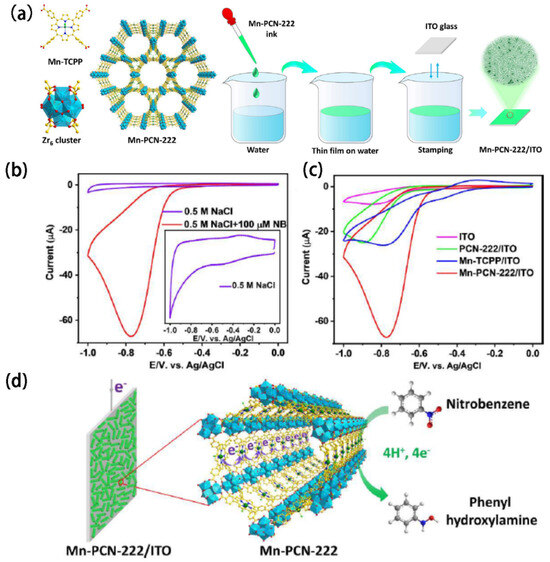 (a) Diagram illustrating the film of Mn-PCN-222 deposited on a conductive indium tin oxide (ITO) surface. (b) Cyclic voltammetry (CV) profiles of the Mn-PCN-222/ITO electrode in a 0.5 M NaCl solution, both with and without 100 μM NB. (c) CV curves obtained from different electrodes focusing on the reduction of 100 μM NB. (d) Schematic representation of the possible mechanism for NB reduction on the Mn-PCN-222/ITO electrode. Reproduced with permission [148].