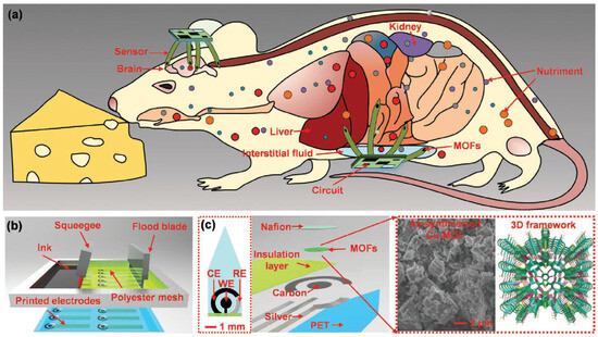 Schematics of MOF-based flexible electrochemical sensors for implant detection. (a) The flexible MOF-based sensors. (b) The screen-printing process of flexible sensors. (c) Multilayer structure of the MOFs electrochemical sensor. Reproduced with permission [158].