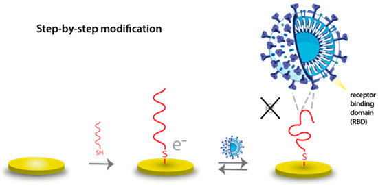 The electrochemical approach was used for fast, sensitive, and selective S-RBD detection as it has been demonstrated to be useful for the detection of host–guest (aptamer/DNA-virus/protein) interactions at the electrode surface [19,20,21]. In this work, a three-electrode system consisting of a gold working electrode (AuE), reference argentochloride electrode (Ag/AgCl), and auxiliary platinum electrode was used for the electrochemical setup. Signals were measured using an Autolab PGSTAT-100 instrument from Metrohm Autolab (Utrecht, The Netherlands), and the measured data were obtained using the NOVA program 1.11.