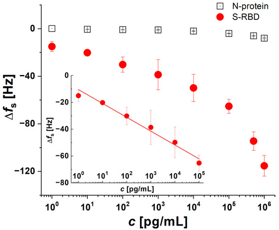An aptamer layer was formed by incubating HS-aptamers in a mixture with 1 mM dodecanethiol. As illustrated in Figure 5, the change in frequency shifts downward with an increase in protein concentration. The plot for S-RBD protein exhibits the characteristics of typical isotherms, demonstrating saturation at higher protein concentrations. In contrast to the observations made with S-RBD, the data indicate that there are minimal changes in Δfs when analyzing N-protein. As illustrated in Figure 5, the sensing layer, comprising thiolated 1C aptamers, displays a high degree of sensitivity to low concentrations. At a concentration of 1 pg/mL of S-RBD, notable changes in Δfs were observed, with a value of 15.0 ± 4.2 Hz. The addition of a maximal concentration of 1 µg/mL of S-RBD resulted in a higher sensor response, Δfs = 115.0 ± 8.7 Hz, in comparison with N-protein at the same concentration. From the calibration curve (Figure 5 inset; ; linear range from 1 pg/mL to 0.1 μg/mL), the limit of detection (LOD) was determined to be 0.07 pg/mL, while the limit of quantification (LOQ) was found to be 0.25 pg/mL.