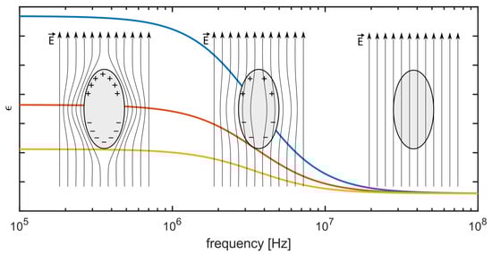 The general course of the real part of the relative permittivity as function of frequency for increasing concentrations (from yellow to red to blue) of living cells in suspension (based on [13]). A higher permittivity change is obtained at lower frequencies, whereas the effect disappears at higher frequencies and cells do no longer contribute to permittivity. The three schematics illustrate the respective degrees of cell membrane polarization and the interaction with the electric field .