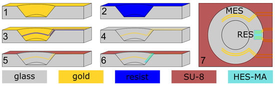 Schematic illustration of impedance sensor microfabrication. 1: sputtering of a chromium-gold double layer. 2: electrodeposition of resist. 3: UV exposure and resist developing. 4: metal etching. 5: spin coating of SU-8, exposure and developing. 6: structuring the hydrogel HES-MA using 2PP. 7: top view of design with measurment electrode system (MES) and reference electrode system (RES).